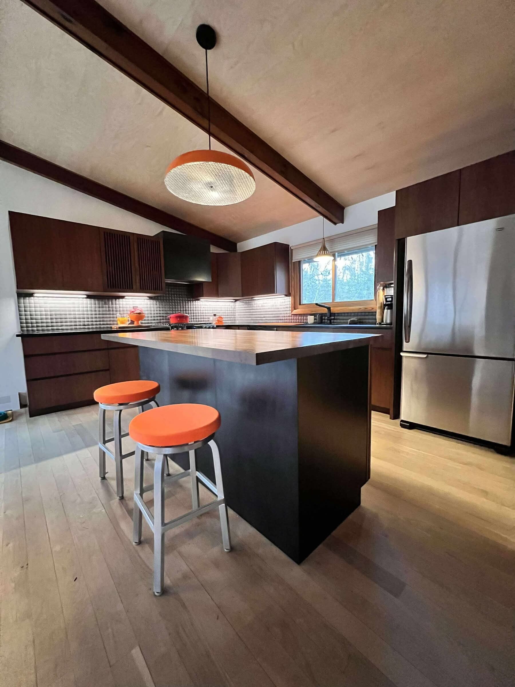 This full kitchen remodel has it all. We removed the old chimney and got rid of the tight space. This open concept is complete with 100% custom built cabinets to our client's specifications. There is no hardware for a sleek look. We installed a custom island complete with black walnut butcher block top and wrapped it with blackened steel panels. Inside these cabinets are multiple drawer slides to make getting to those hard-to-reach spaces so much easier, a garbage/recycling drawer, maple lazy susan in the corner and a beautiful butcher block mixer lift. We lightened the space with fresh, light ceiling panels. The new flooring, back splash and pops of orange pull this space together.